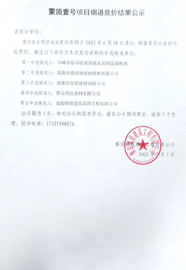 蒙頂壹號(hào)項(xiàng)目煙道采購競價(jià)結(jié)果公示