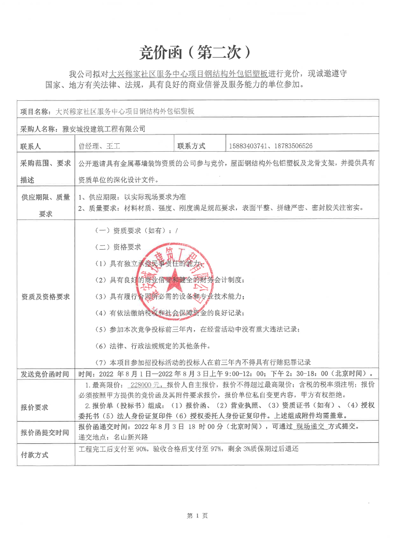 大興穆家社區(qū)服務(wù)中心項(xiàng)目鋼結(jié)構(gòu)外包鋁塑板競價(jià)公告(第二次)