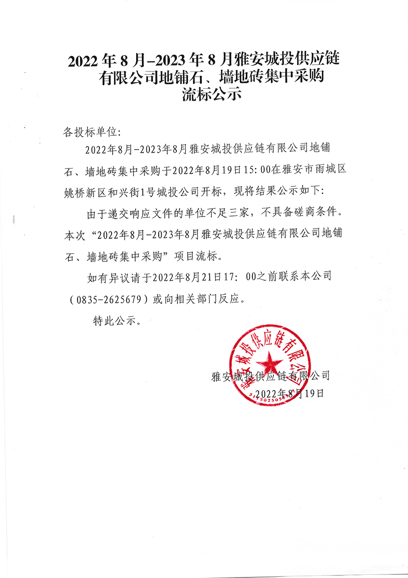 2022年8月-2023年8月雅安城投供應(yīng)鏈有限公司地鋪石、墻地磚集中采購流標(biāo)公示