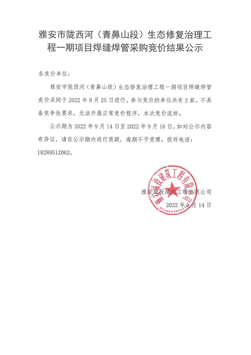 雅安市隴西河(青鼻山段)生態(tài)修復(fù)治理工程一期項(xiàng)目焊縫焊管采購(gòu)競(jìng)價(jià)結(jié)果公示