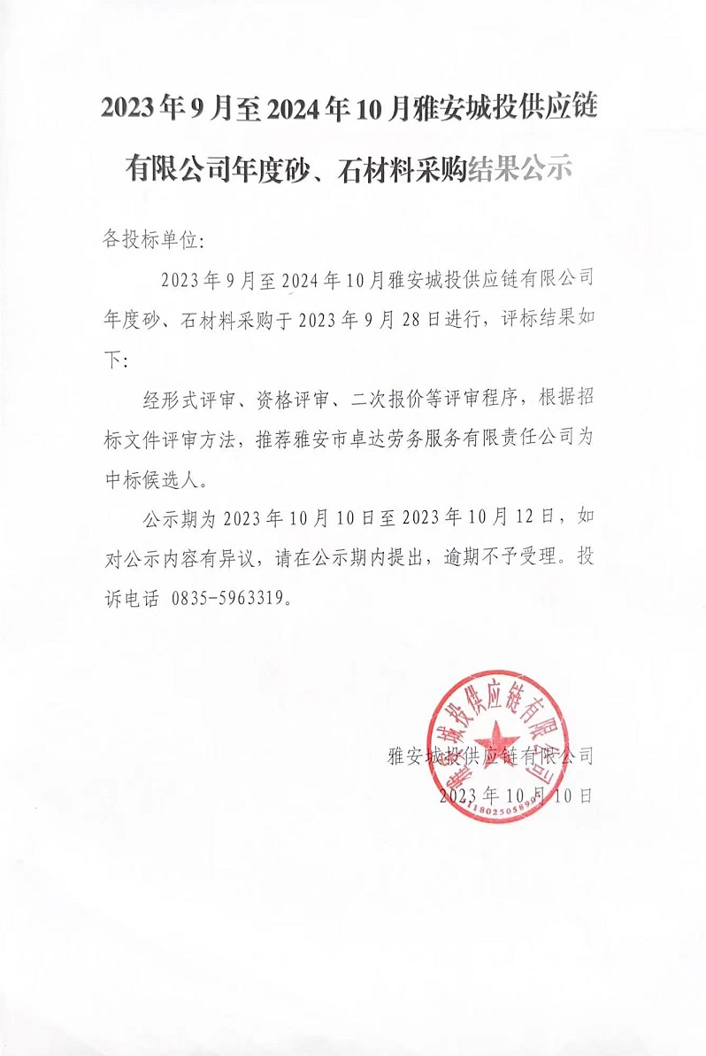 2023年9月至2024年10月雅安城投供應鏈有限公司年度砂、石材料采購結(jié)果公示