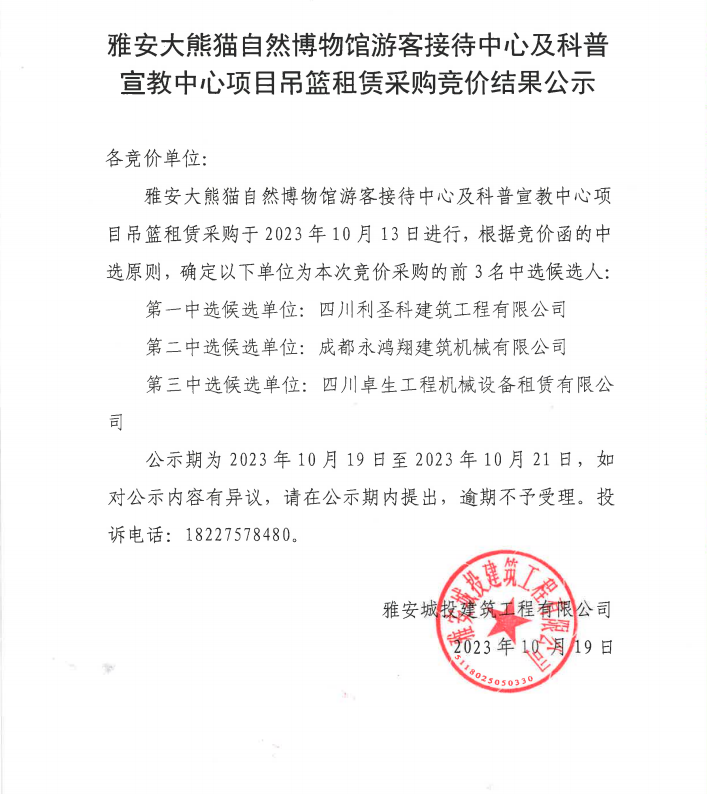 雅安大熊貓自然博物館游客接待中心及科普宣教中心項目吊籃租賃采購競價結(jié)果公示