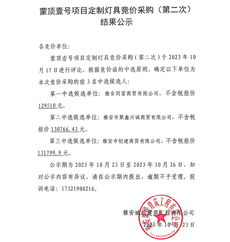 蒙頂壹號(hào)項(xiàng)目定制燈具競(jìng)價(jià)采購(gòu)(第二次)結(jié)果公示