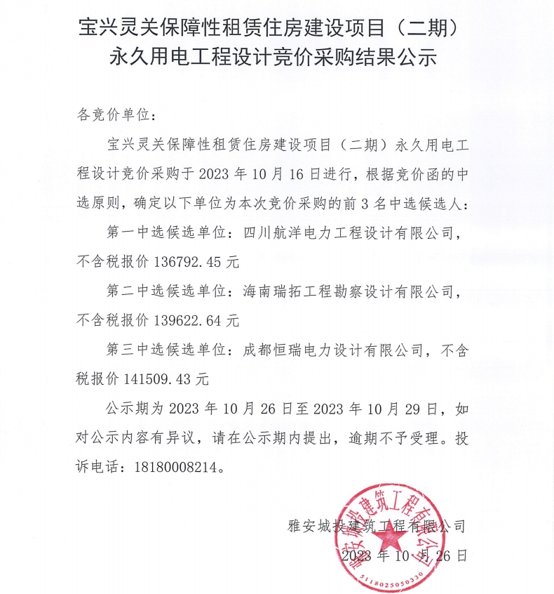 寶興靈關(guān)保障性租賃住房建設(shè)項(xiàng)目(二期)永久用電工程設(shè)計(jì)競價(jià)采購結(jié)果公示