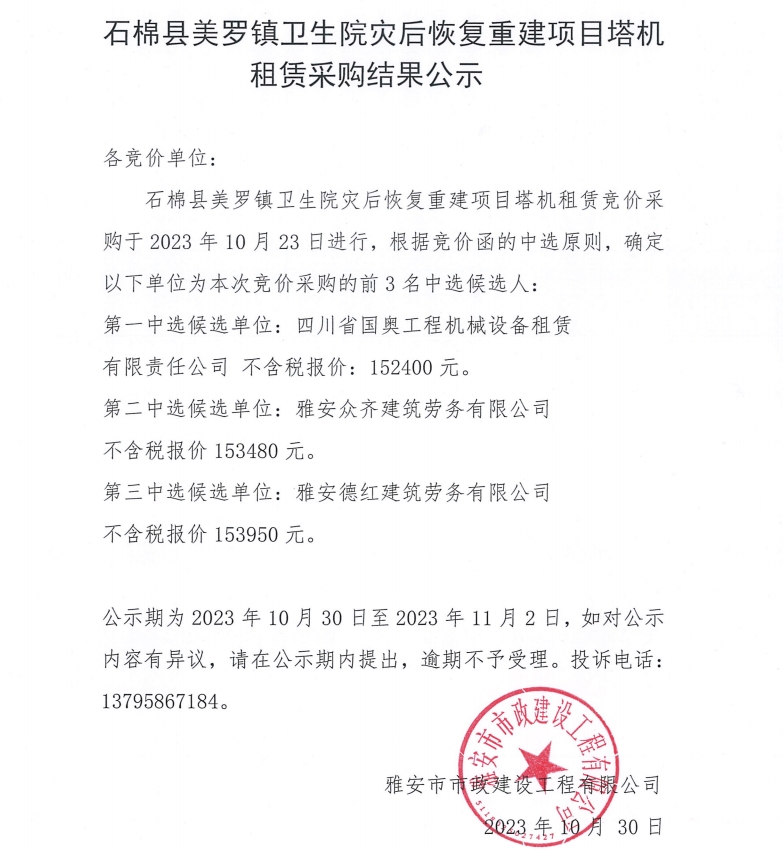 石棉縣美羅鎮(zhèn)衛(wèi)生院災后恢復重建項目塔機租賃采購結(jié)果公示
