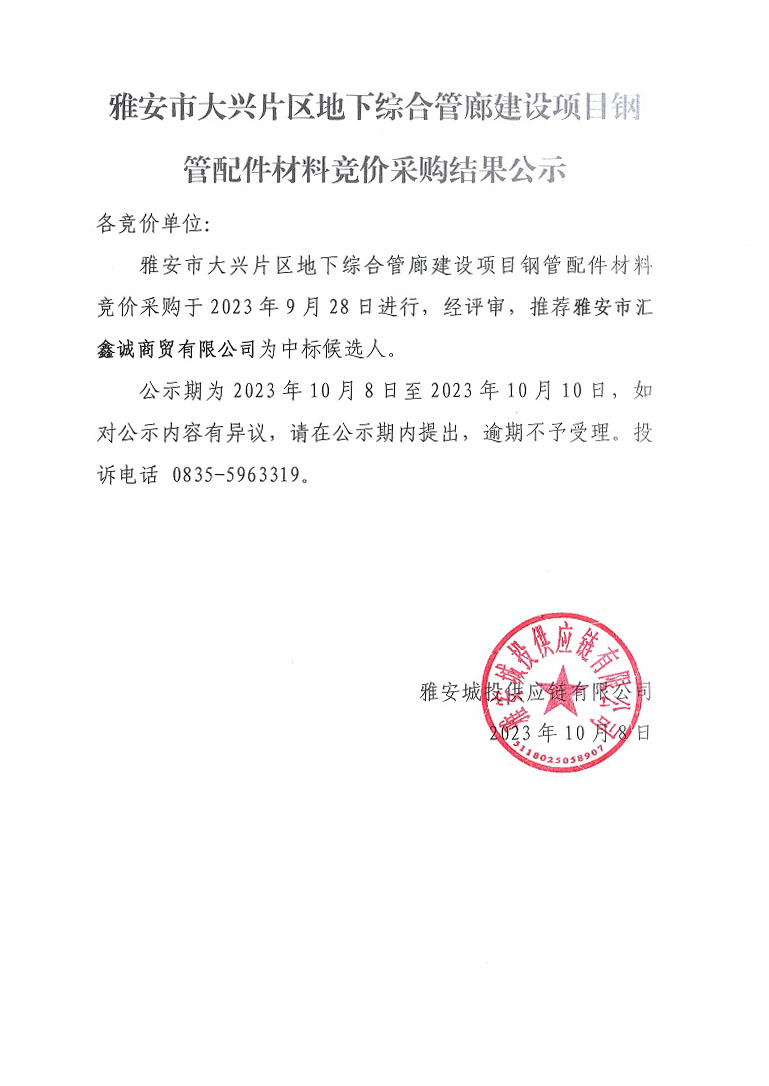 雅安市大興片區(qū)地下綜合管廊建設項目鋼管配件材料競價采購結果公示