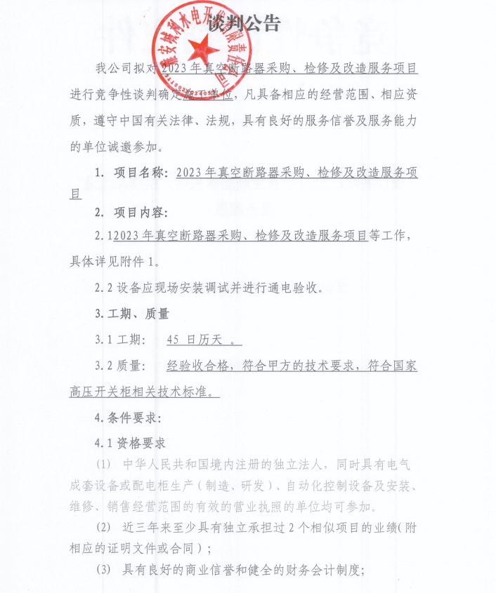 2023年真空斷路器采購、檢修及改造服務(wù)項(xiàng)目談判公告