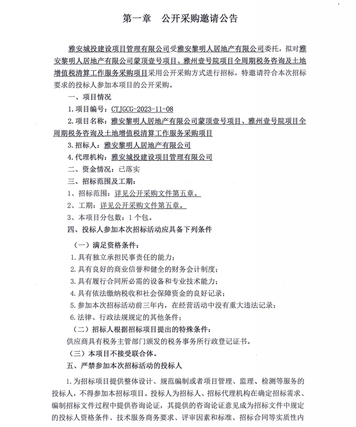 雅安黎明人居地產(chǎn)有限公司蒙頂壹號(hào)項(xiàng)目、雅州壹號(hào)院項(xiàng)目全周期稅務(wù)咨詢及土地增值稅清算工作服務(wù)采購(gòu)項(xiàng)目公開采購(gòu)邀請(qǐng)公告