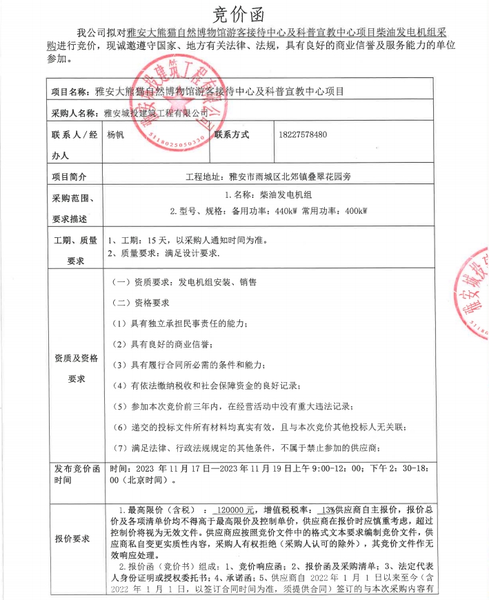 雅安大熊貓自然博物館游客接待中心及科普宣教中心項目柴油發(fā)電機組采購競價公告