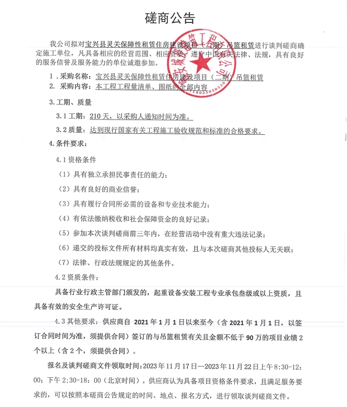寶興靈關(guān)保障性租賃住房建設(shè)項目(二期)吊籃租賃談判磋商公告