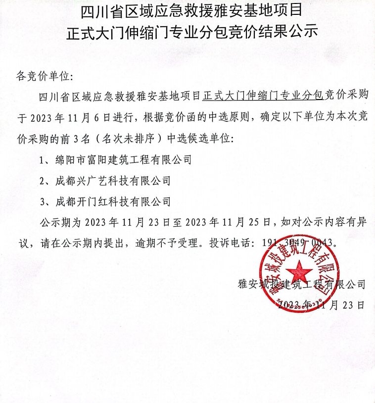 四川省區(qū)域應(yīng)急救援雅安基地項(xiàng)目正式大門伸縮門專業(yè)分包競(jìng)價(jià)結(jié)果公示