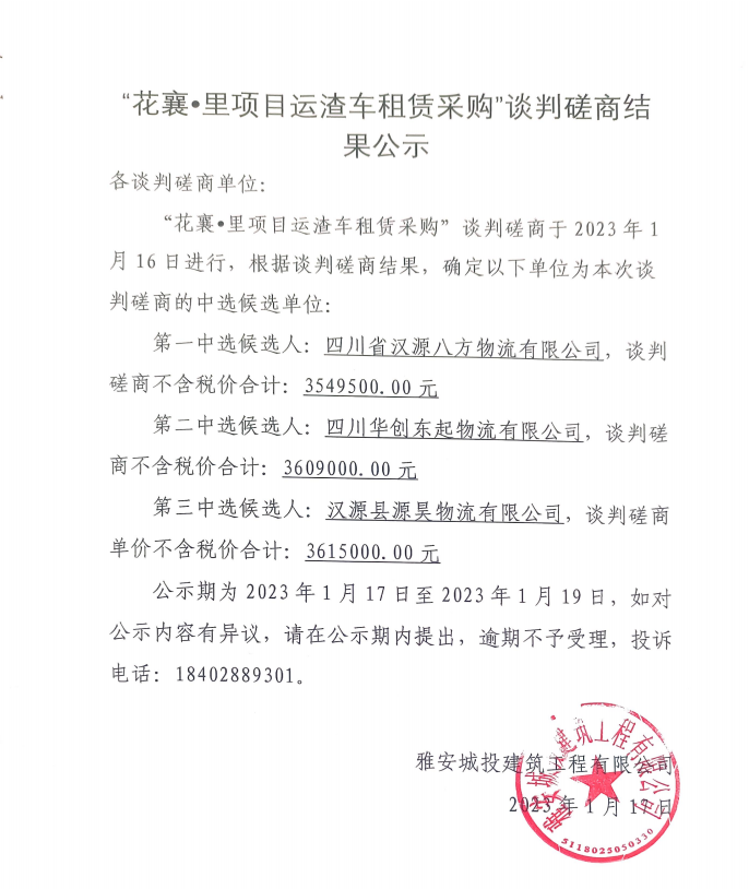 花襄·里項(xiàng)目運(yùn)渣車租賃采購談判磋商結(jié)果公示