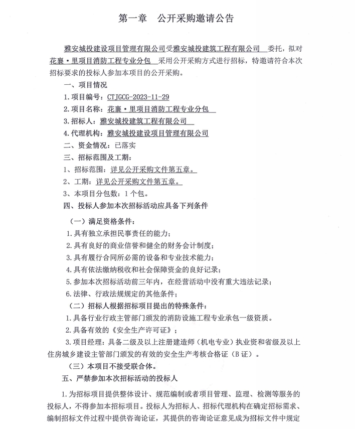 花襄·里項目消防工程專業(yè)分包公開采購邀請公告