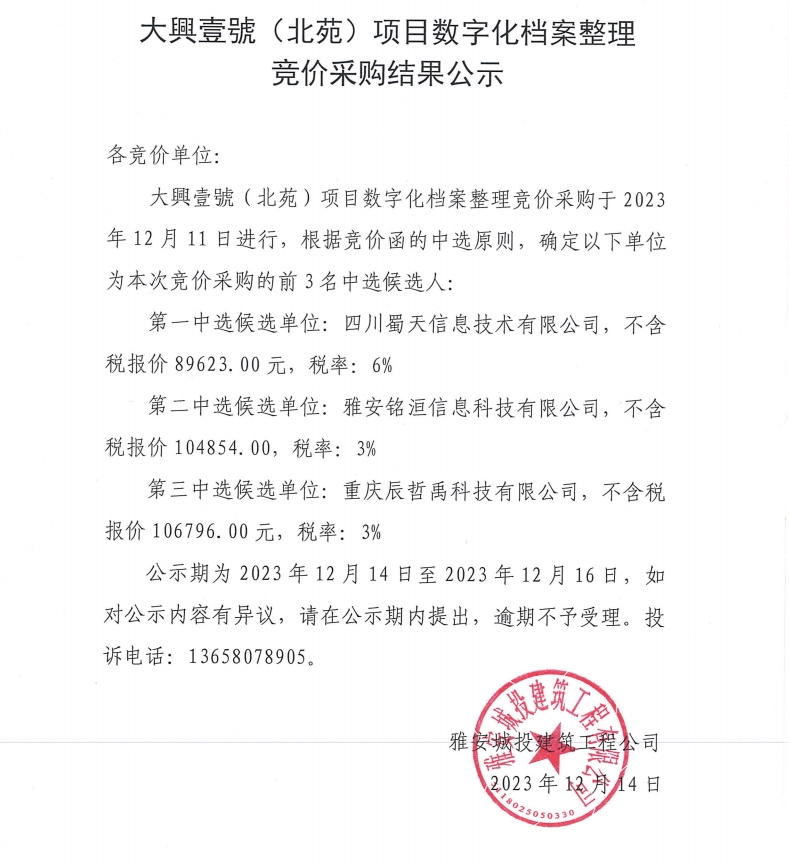 大興壹號(北苑)項目數(shù)字化檔案整理競價采購結(jié)果公示