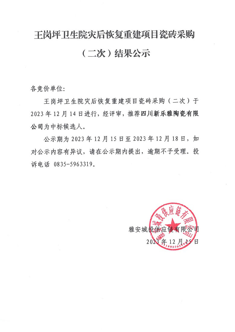 王崗坪衛(wèi)生院災(zāi)后恢復(fù)重建項(xiàng)目瓷磚采購(二次)結(jié)果公示