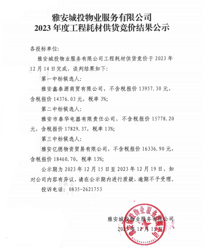 雅安城投物業(yè)服務(wù)有限公司2023年度工程耗材供貨競(jìng)價(jià)結(jié)果公示