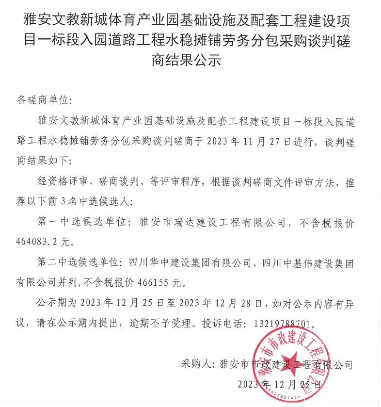 雅安文教新城體育產(chǎn)業(yè)園基礎(chǔ)設(shè)施及配套工程建設(shè)項目一標(biāo)段入園道路工程水穩(wěn)攤鋪勞務(wù)采購談判磋商結(jié)果公示