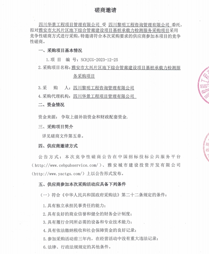 雅安市大興片區(qū)地下綜合管廊建設(shè)項(xiàng)目基樁承載力檢測服務(wù)采購項(xiàng)目磋商邀請公告
