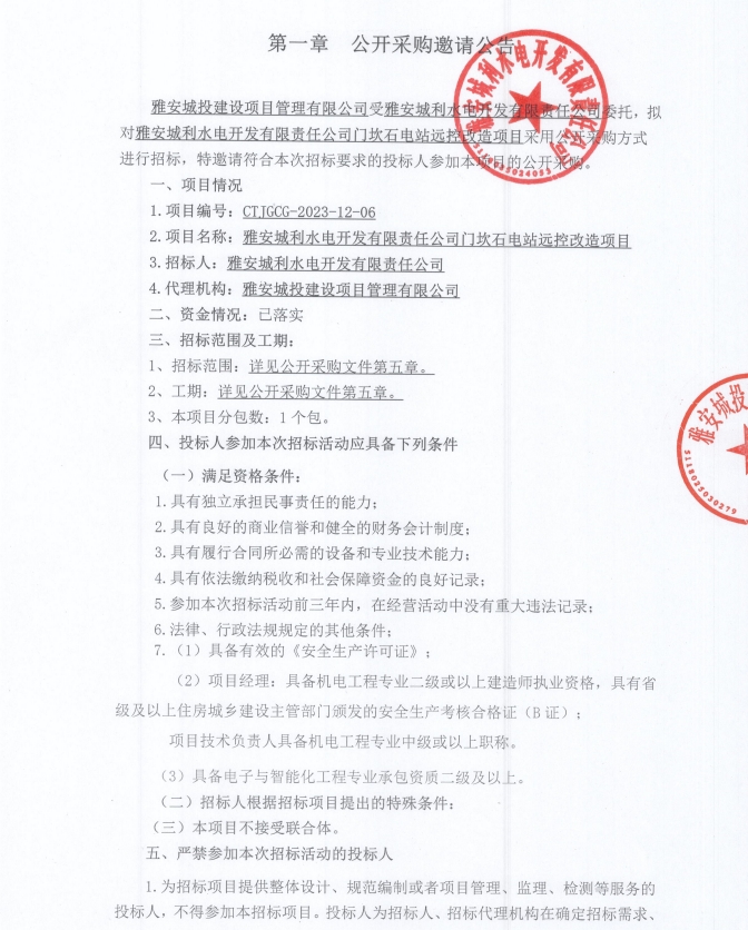 雅安城利水電開發(fā)有限責(zé)任公司門坎石電站遠(yuǎn)控改造項(xiàng)目公開采購邀請公告