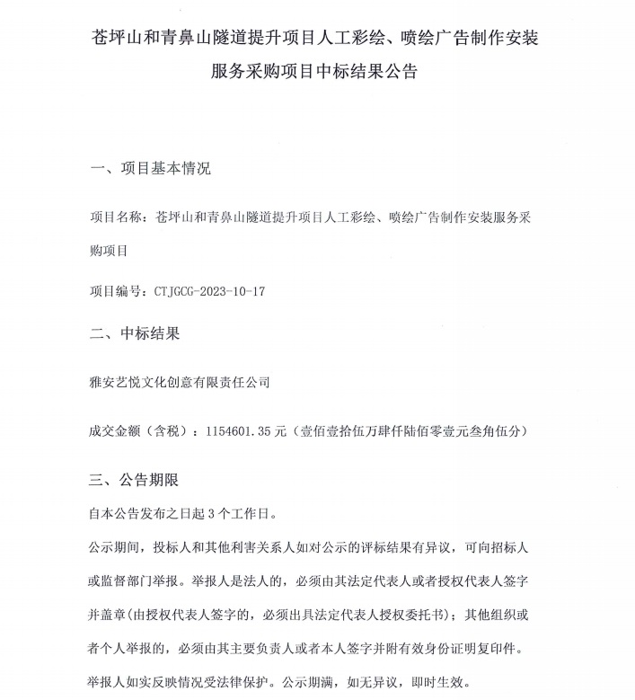 蒼坪山和青鼻山隧道提升項目人工彩繪、噴繪廣告制作安裝服務采購項目中標結果公告