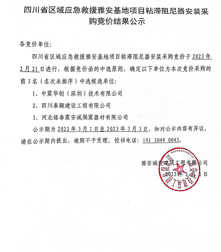 四川省區(qū)域應(yīng)急救援雅安基地項目粘滯阻尼器安裝采購競價結(jié)果公示