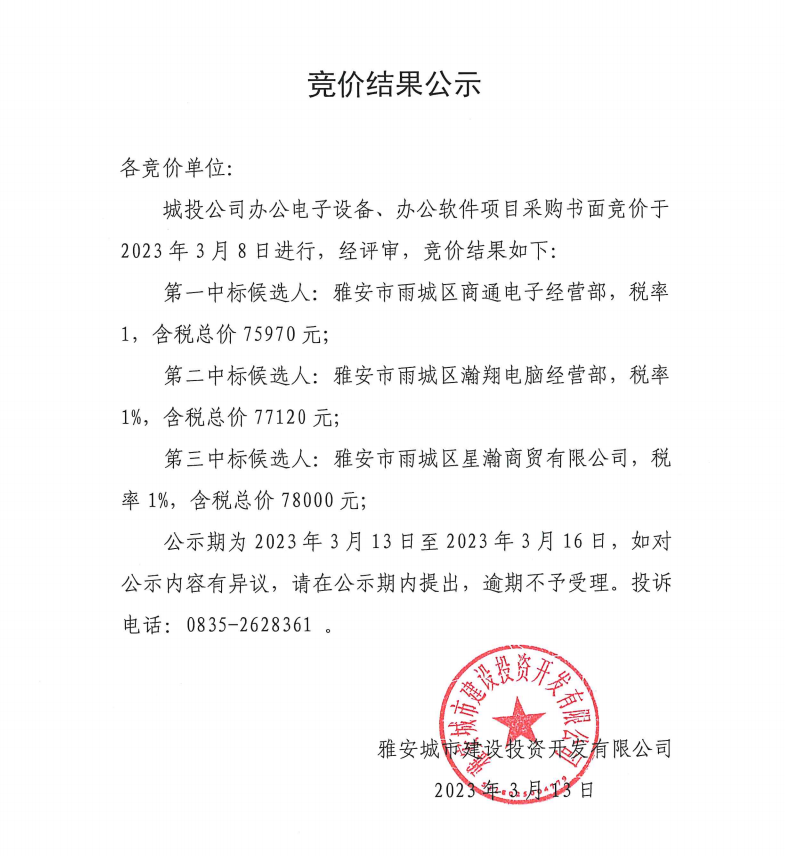 城投公司辦公電子設備、辦公軟件項目采購競價結果公示