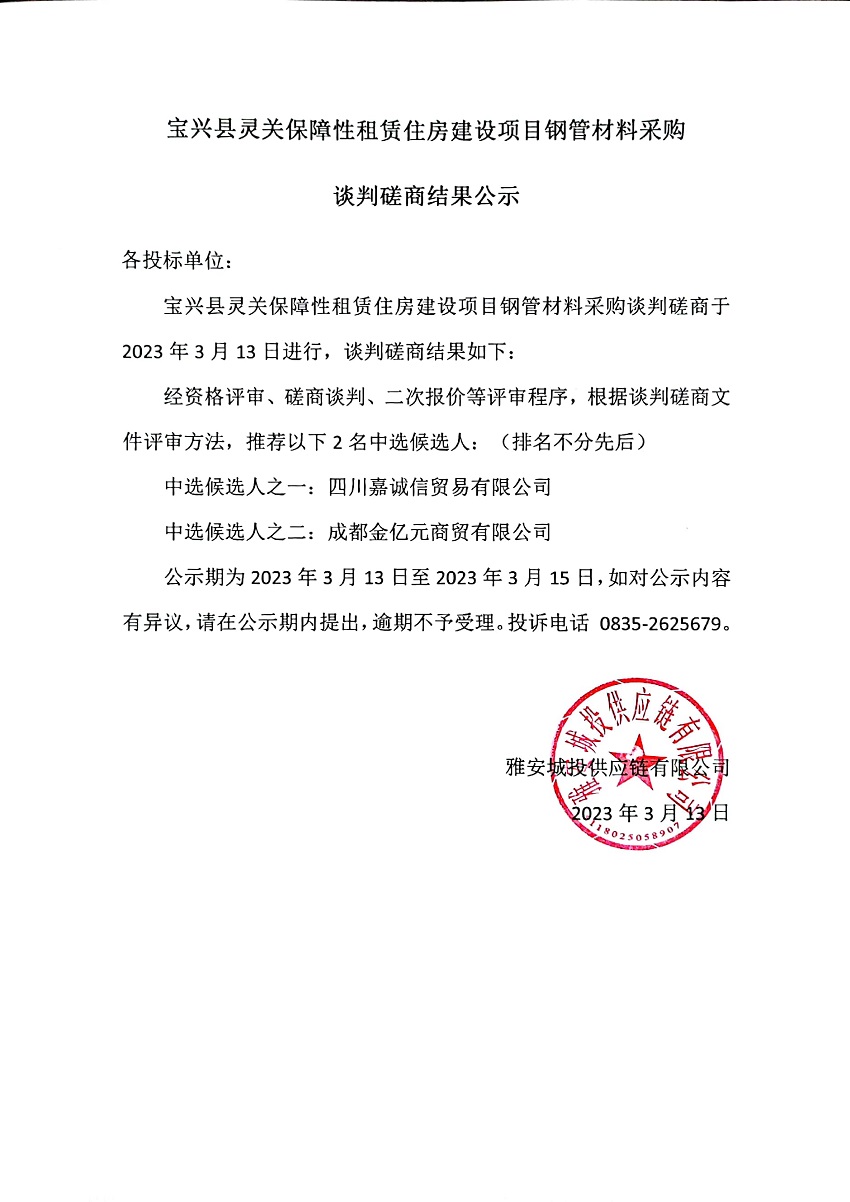 寶興縣靈關保障性租賃住房建設項目鋼管材料采購談判磋商結果公示