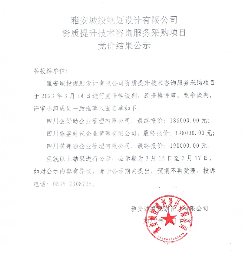 雅安城投規(guī)劃設(shè)計(jì)有限公司資質(zhì)提升技術(shù)咨詢服務(wù)采購項(xiàng)目競價結(jié)果公示