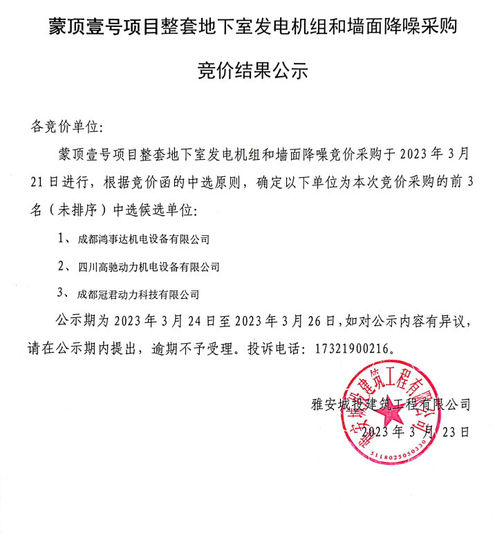 蒙頂壹號(hào)項(xiàng)目整套地下室發(fā)電機(jī)組和墻面降噪采購(gòu)競(jìng)價(jià)結(jié)果公示