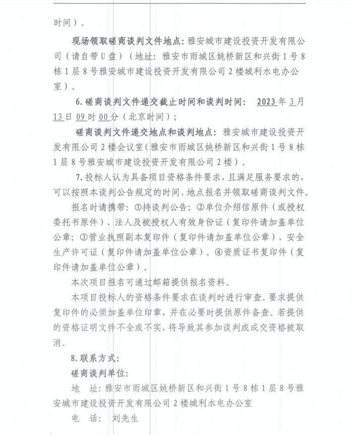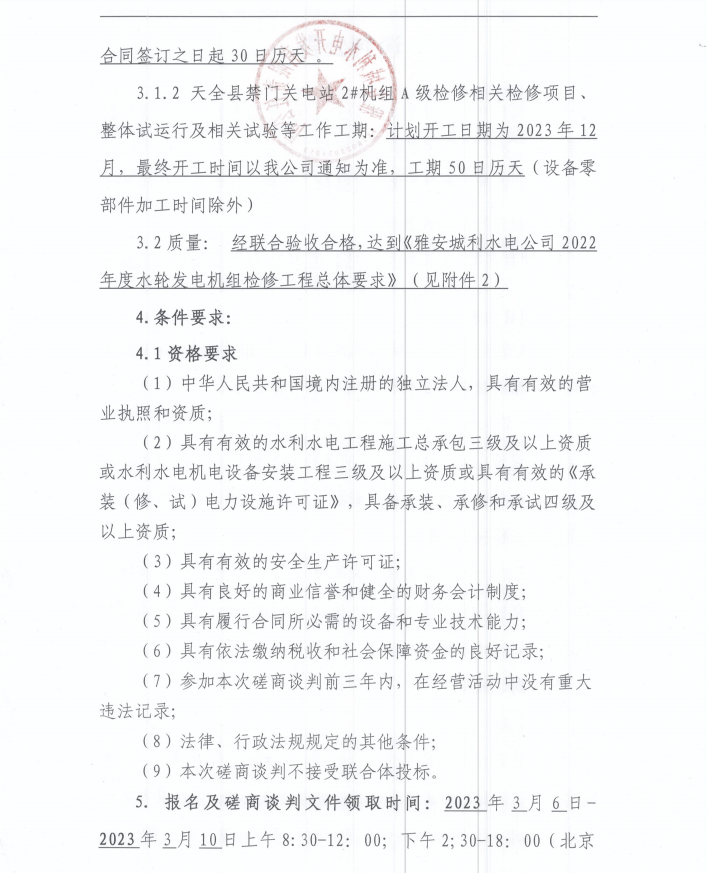 雅安城利水電公司2022年度水輪發(fā)電機組檢修工程(第三次)磋商談判公告