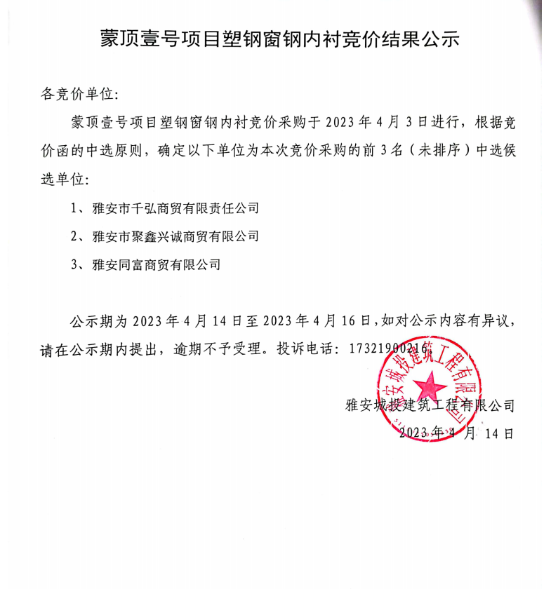 蒙頂壹號項目塑鋼窗內(nèi)襯競價結(jié)果公示