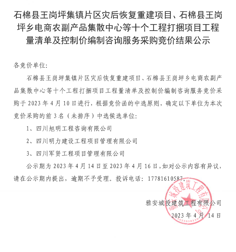 石棉縣王崗坪集鎮(zhèn)片區(qū)災(zāi)后恢復(fù)重建項(xiàng)目、石棉縣王崗坪鄉(xiāng)電商農(nóng)副產(chǎn)品集散中心等十個(gè)工程打捆項(xiàng)目工程量清單及控制價(jià)編制咨詢服務(wù)采購(gòu)競(jìng)價(jià)結(jié)果公示