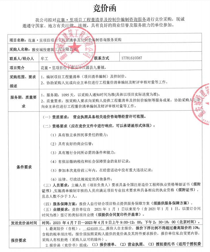 花襄·里項(xiàng)目工程量清單及招標(biāo)控制價(jià)編制咨詢服務(wù)采購(gòu)競(jìng)價(jià)公告