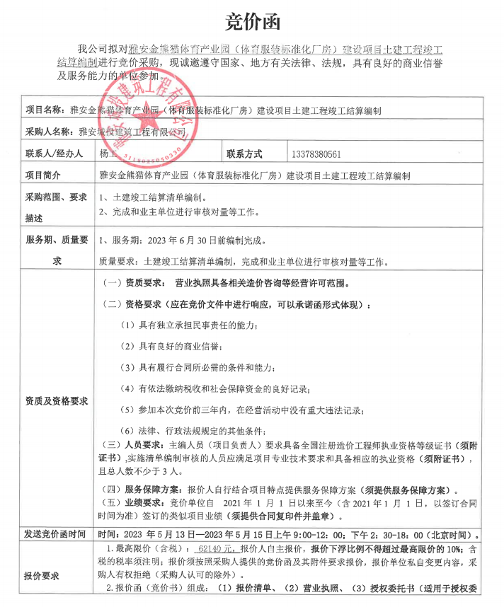 雅安金熊貓?bào)w育產(chǎn)業(yè)園(體育服裝標(biāo)準(zhǔn)化廠房)建設(shè)項(xiàng)目土建工程竣工結(jié)算編制競(jìng)價(jià)公告