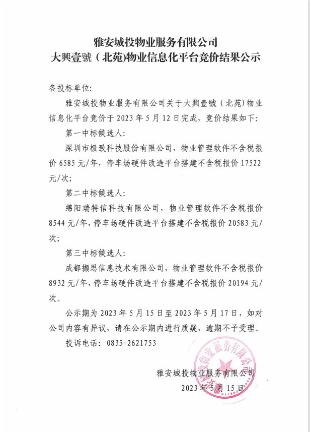 大興壹號(北苑)物業(yè)信息化平臺競價結果公示