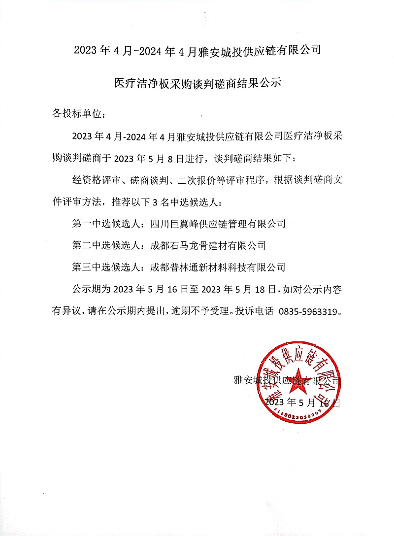 2023年4月-2024年4月雅安城投供應鏈有限公司醫(yī)療潔凈板采購談判磋商結果公示