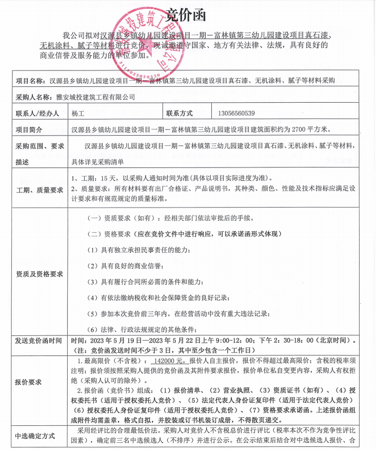 漢源縣鄉(xiāng)鎮(zhèn)幼兒園建設(shè)項(xiàng)目一期一富林鎮(zhèn)第三幼兒園建設(shè)項(xiàng)目真石漆、無(wú)機(jī)涂料、膩?zhàn)拥炔牧喜少?gòu)競(jìng)價(jià)公告