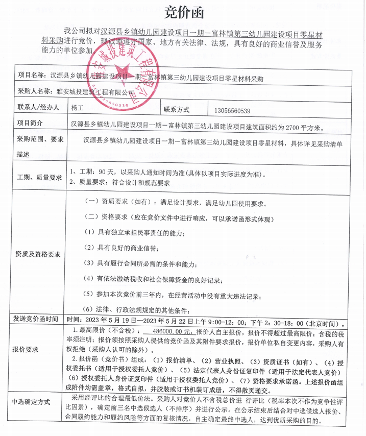漢源縣鄉(xiāng)鎮(zhèn)幼兒園建設(shè)項(xiàng)目一期一富林鎮(zhèn)第三幼兒園建設(shè)項(xiàng)目零星材料采購(gòu)競(jìng)價(jià)公告