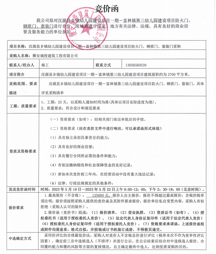 漢源縣鄉(xiāng)鎮(zhèn)幼兒園建設(shè)項目一期一富林鎮(zhèn)第三幼兒園建設(shè)項目防火門、鋼質(zhì)門、套裝門采購競價公告