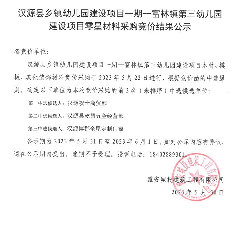 漢源縣鄉(xiāng)鎮(zhèn)幼兒園建設(shè)項(xiàng)目一期--富林鎮(zhèn)第三幼兒園建設(shè)項(xiàng)目零星材料采購(gòu)競(jìng)價(jià)結(jié)果公示