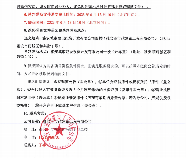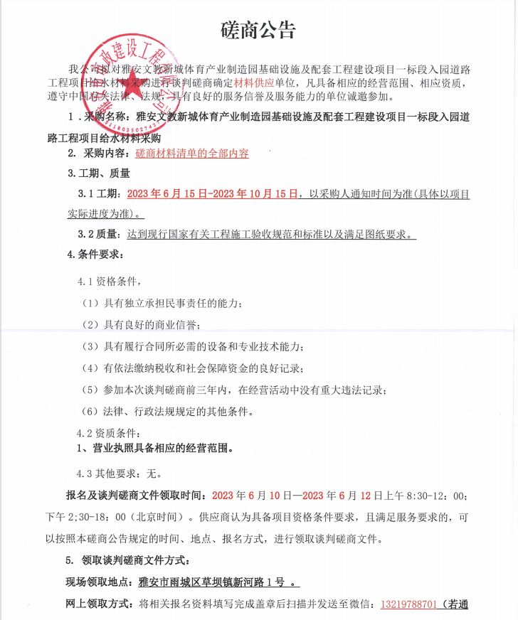 雅安文教新城體育產(chǎn)業(yè)制造園基礎(chǔ)設(shè)施及配套工程建設(shè)項目一標段入園道路工程項目給水材料采購談判磋商公告