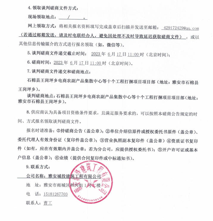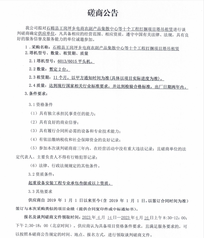 石棉縣王崗坪鄉(xiāng)電商農(nóng)副產(chǎn)品集散中心等十個工程打捆項目塔吊租賃談判磋商公告