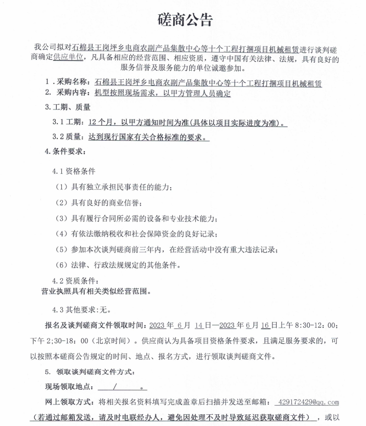 石棉縣王崗坪鄉(xiāng)電商農(nóng)副產(chǎn)品集散中心等十個工程打捆項目機械租賃談判磋商公告