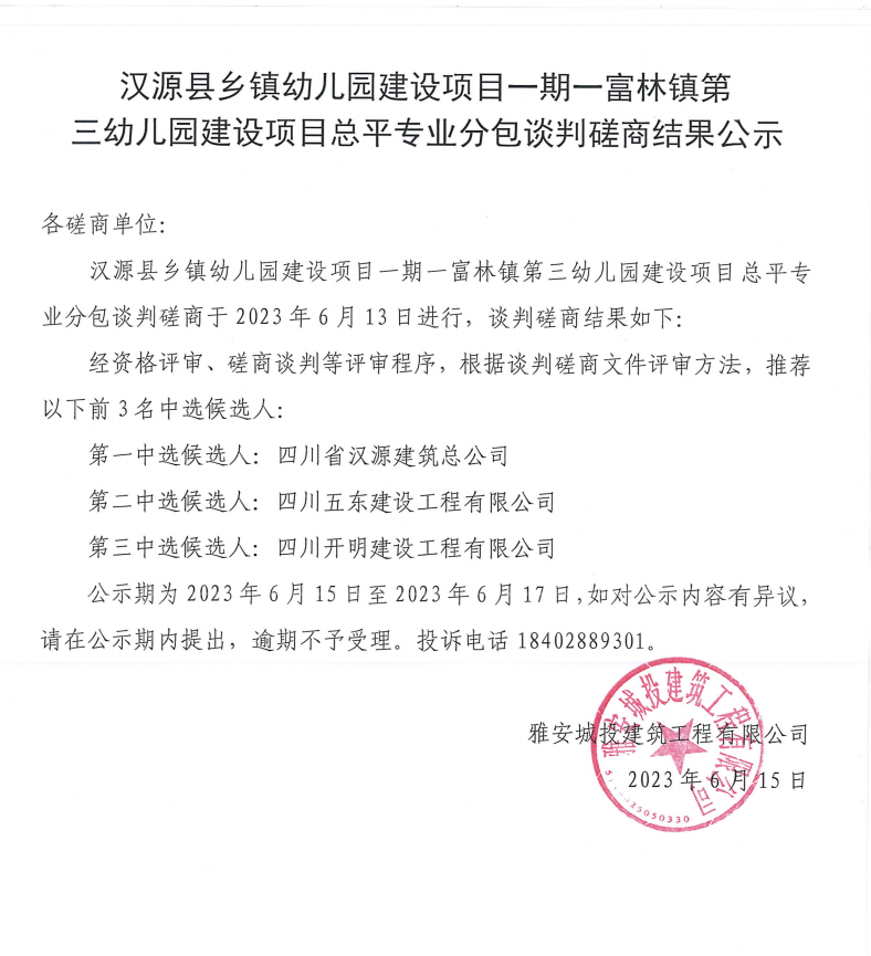 漢源縣鄉(xiāng)鎮(zhèn)幼兒園建設項目一期--富林鎮(zhèn)第三幼兒園建設項目總平專業(yè)分包談判磋商結果公示