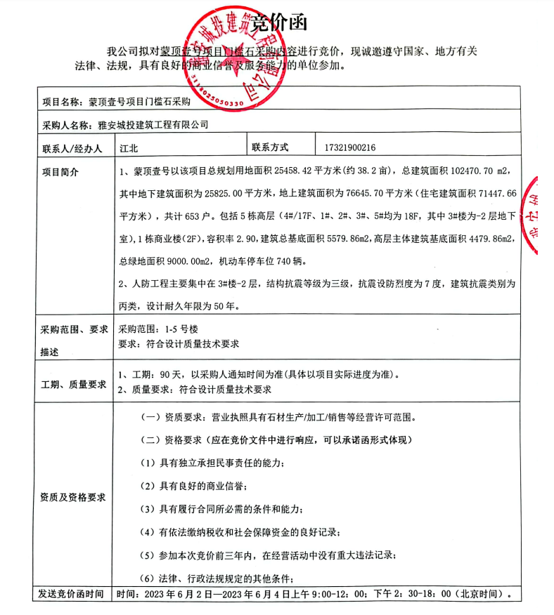 蒙頂壹號項(xiàng)目門檻石采購競價公告