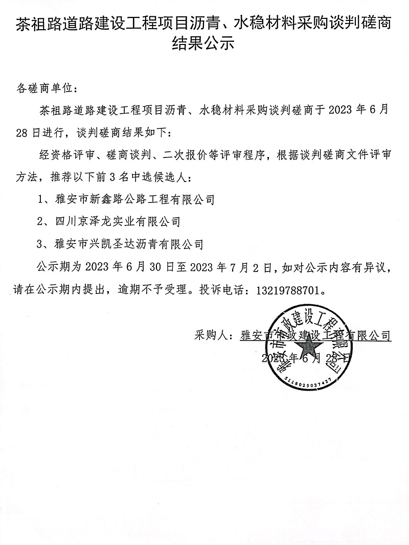 茶祖路道路建設(shè)工程瀝青、水穩(wěn)采購談判磋商結(jié)果公示