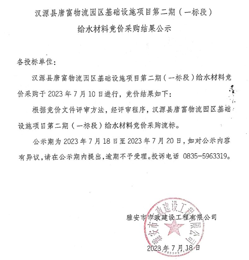 漢源縣唐富物流園區(qū)基礎(chǔ)設(shè)施項(xiàng)目二期(一標(biāo)段)給水材料競(jìng)價(jià)采購(gòu)結(jié)果公示