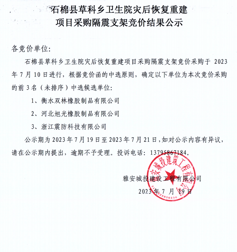 石棉縣草科鄉(xiāng)衛(wèi)生院災(zāi)后恢復(fù)重建項(xiàng)目采購隔震支架競價(jià)結(jié)果公示