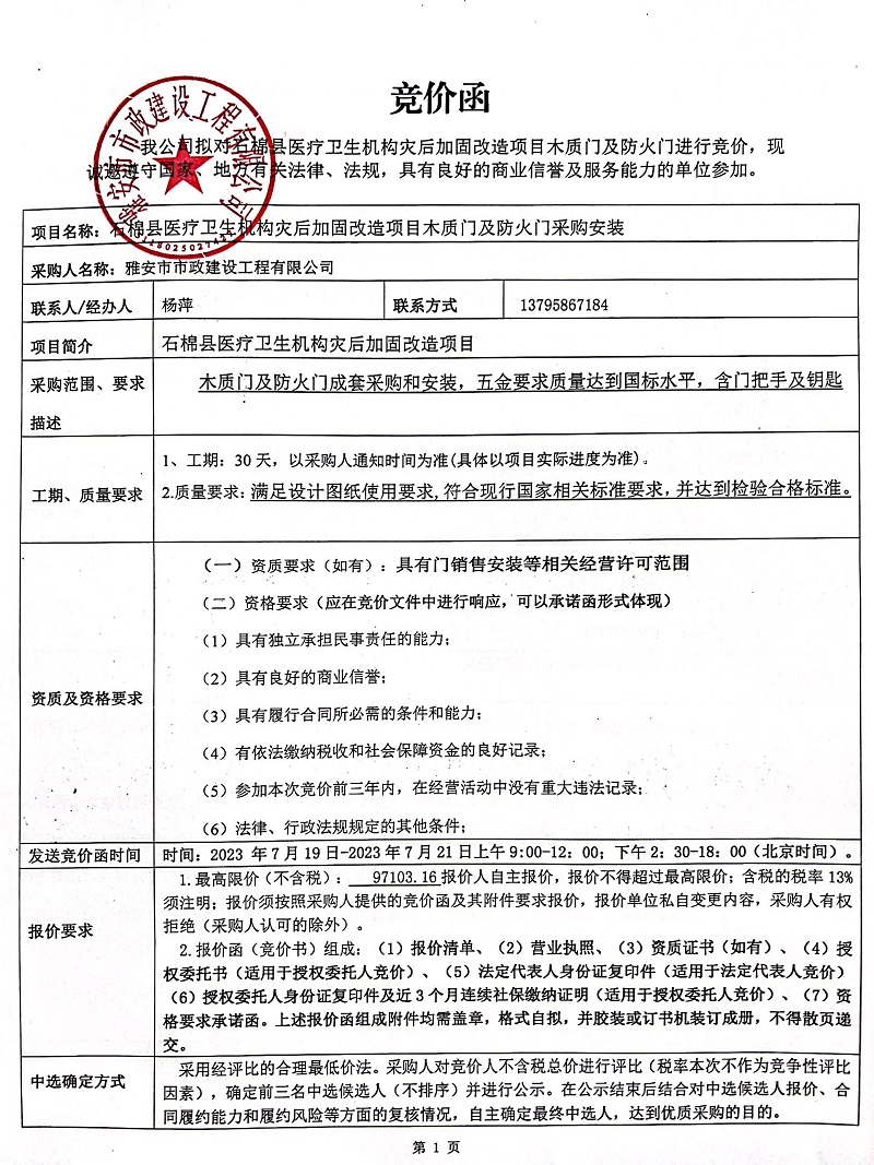 石棉縣醫(yī)療衛(wèi)生機(jī)構(gòu)災(zāi)后加固改造項(xiàng)目木質(zhì)門及防火門采購安裝競價(jià)公告