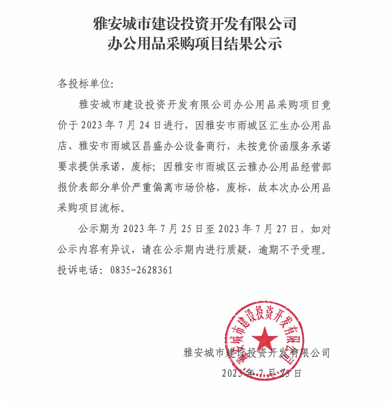 雅安城市建設(shè)投資開發(fā)有限公司辦公用品采購(gòu)項(xiàng)目結(jié)果公示